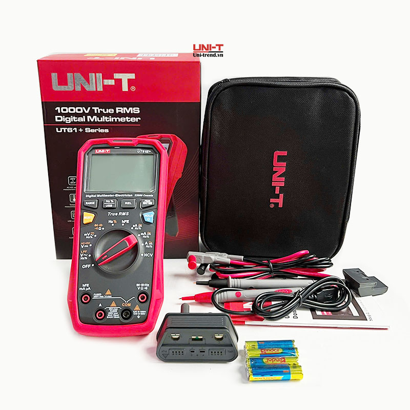 Phụ kiện tiêu chuẩn Pin, dây đo mạ vàng, cáp USB, đầu dò nhiệt độ (UT61D+), ổ cắm đa năng (UT61E+), sách hướng dẫn tiếng Anh