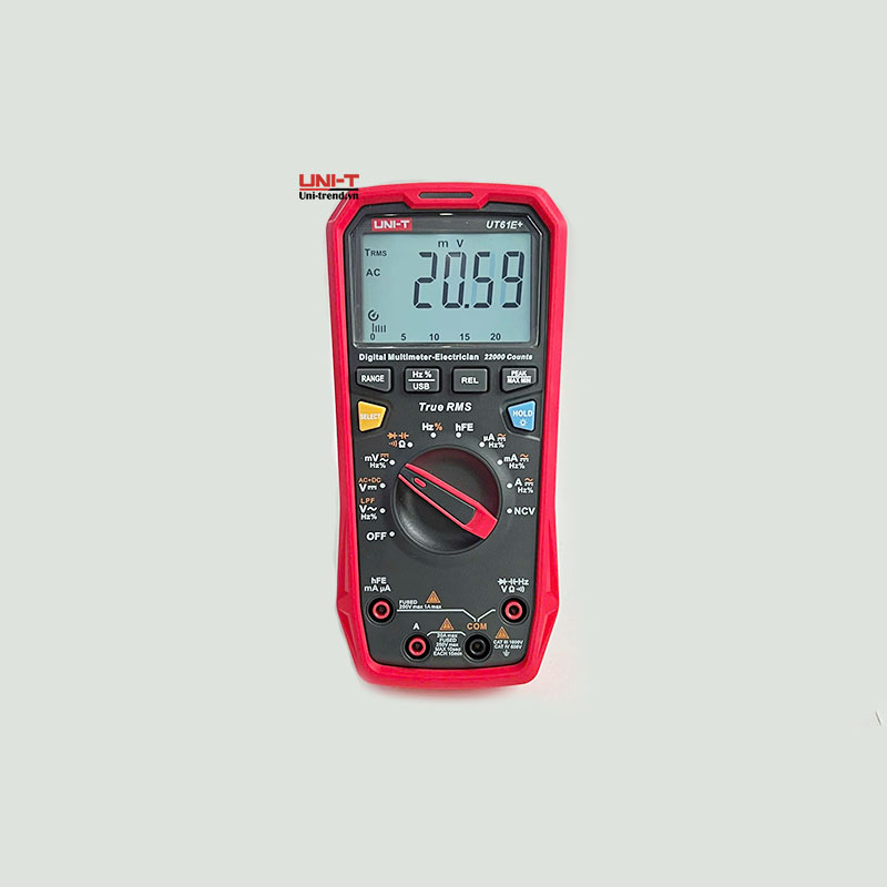 Giới thiệu sản phẩm: UT61E+ là đồng hồ vạn năng kỹ thuật số True RMS cầm tay với hiệu suất ổn định và độ tin cậy cao. Nó có thể được sử dụng để đo: điện áp AC và DC, dòng điện AC và DC, điện trở, điện dung, tần số, độ rộng xung, diode, bóng bán dẫn và thông mạch. Nó được trang bị chức năng đo biến tần LPF và NCV chuyên nghiệp. Ngoài ra còn có thông báo  bằng âm thanh và đèn led, Sản phẩm có giao tiếp USB với máy tính, có thể kết nối với phụ kiện Bluetooth UT-D07B để hiển thị kết quả đo trên điện thoại thông minh, cho phép bạn thu được kết quả kiểm tra một cách trực quan hơn. và thực hiện các phép đo nhanh chóng và an toàn hơn. Được trang bị chức năng đèn nền nên có thể sử dụng liên tục trong trường hợp mất điện.