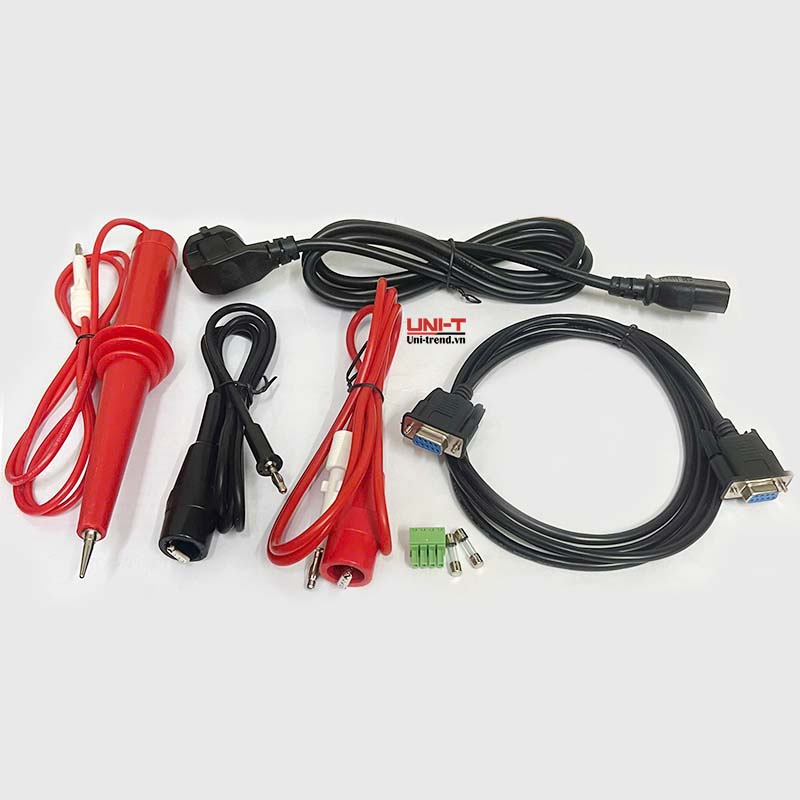 Hộp, cáp RS232, dây thử điện áp cao,kẹp thử điện áp cao đen - đỏ, dây nguồn, cầu chì, jack cắm 4P |