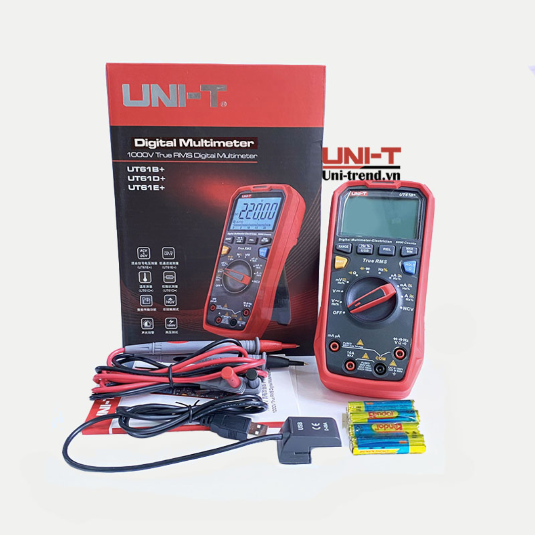 Giới thiệu sản phẩm: UT61B+ là đồng hồ vạn năng kỹ thuật số True RMS cầm tay với hiệu suất ổn định và độ tin cậy cao. Nó có thể được sử dụng để đo: điện áp AC và DC, dòng điện AC và DC, điện trở, điện dung, tần số, độ rộng xung, diode và thông mạch. với chức năng đo NCV chuyên nghiệp có thể phân biệt nhanh chóng và chính xác dây dẫn có điện. Ngoài ra, nó còn có thông báo bằng âm thanh và đèn led. Sản phẩm có giao tiếp USB với máy tính, có thể kết nối với phụ kiện Bluetooth UT-D07B để hiển thị kết quả đo trên điện thoại thông minh, cho phép bạn thu được kết quả kiểm tra một cách trực quan, nhanh chóng hơn và thực hiện các phép đo an toàn hơn. Được trang bị chức năng đèn nền nên có thể sử dụng liên tục trong trường hợp mất điện.