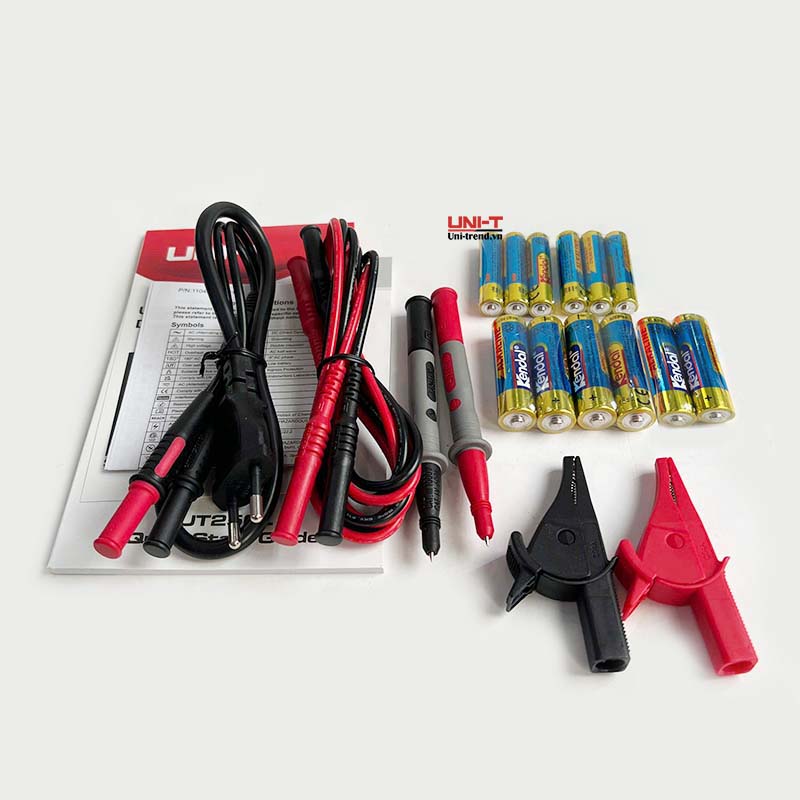 Túi vải + hộp, Pin AAA 1,5V (6), pin AA 1,5V (6), đầu dò thử nghiệm (2 màu đỏ và đen), dây dẫn thử nghiệm kép (2 màu đỏ và đen), kẹp cá sấu (2 màu đỏ và đen), một cáp phích cắm Châu Âu, sách hướng dẫn bằng tiếng Trung và tiếng Anh, hướng dẫn nhanh bằng tám ngôn ngữ |