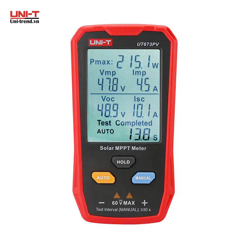 Giới thiệu sản phẩm: Máy đo MPPT năng lượng mặt trời UT673PV có thể xác định hiệu quả mọi bất thường trong tấm pin mặt trời bằng cách kiểm tra công suất tối đa, điện áp công suất cực đại, dòng điện công suất cực đại, điện áp mạch hở và dòng điện ngắn mạch. Với màn hình rộng và khả năng đo tự động, hiển thị tất cả kết quả đo cùng lúc trên màn hình và đặc biệt sản phẩm không sử dụng pin vì có thể thực hiện phép đo dễ dàng trong thời gian dài. Thiết kế di động giúp dễ dàng mang theo, nâng cao đáng kể hiệu quả vận hành và bảo trì cho các kỹ thuật viên, nhà sản xuất, thợ lắp đặt và người dùng.