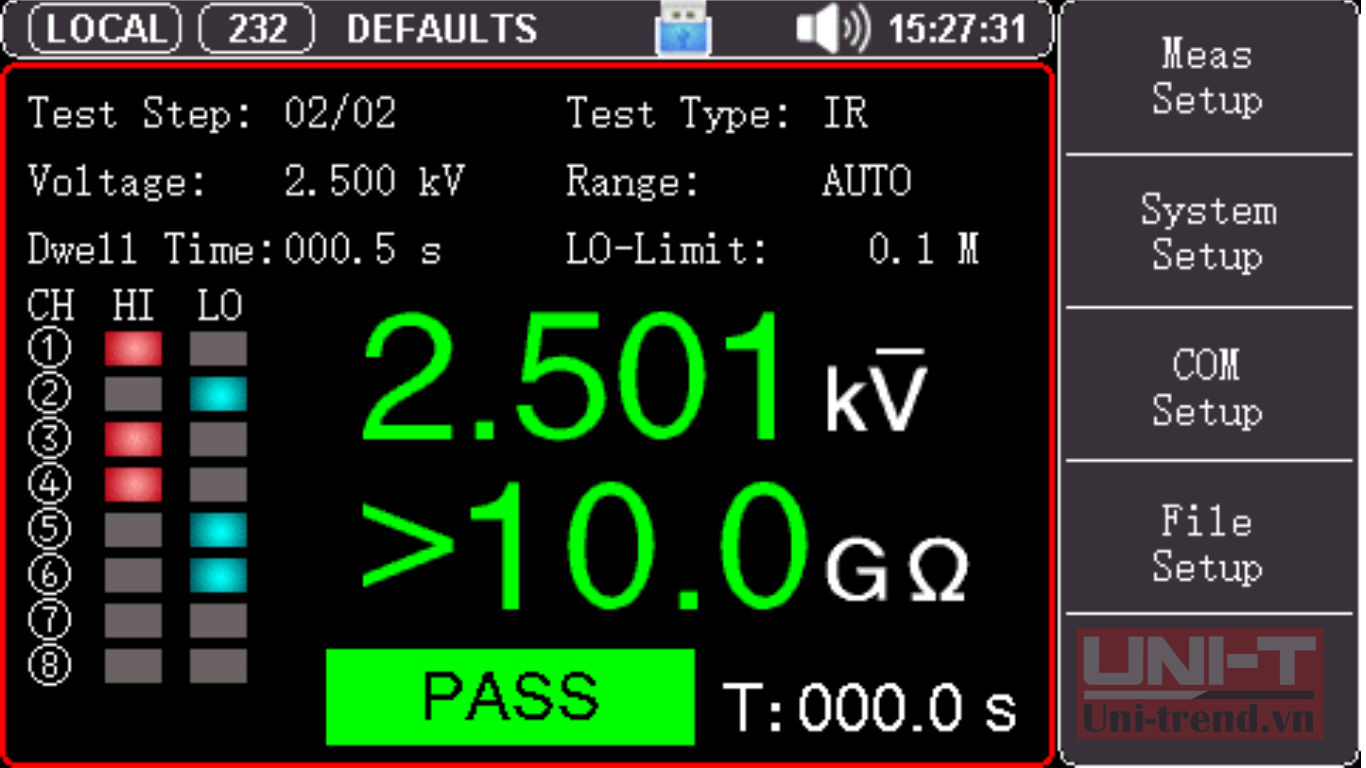 Điện áp thử nghiệm điện trở cách điện là 2,5kV theo tiêu chuẩn, 5,0kV là tùy chọn, phù hợp cho nhiều dịp thử nghiệm hơn